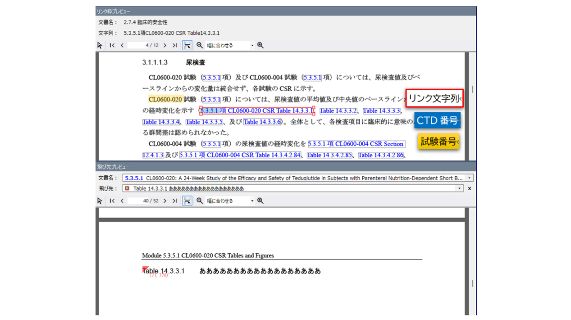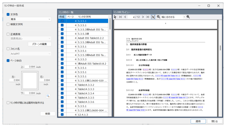 Medical writers can search for sections where specific text colors or symbols ([ ]) are specified for creating document-to-document links, then convert them collectively into link frames.
