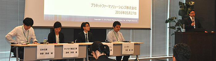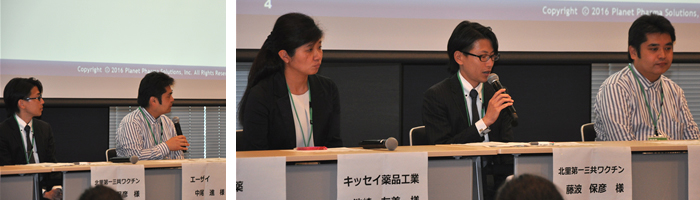 エーザイ株式会社 中尾 進 様 北里第一三共ワクチン株式会社 藤波 保彦 様 キッセイ薬品工業株式会社 池崎 友美 様 日本化薬株式会社 狩野 英成 様 <司会>プラネットファーマソリューションズ株式会社 上野 政之