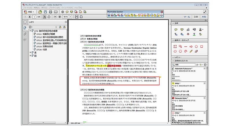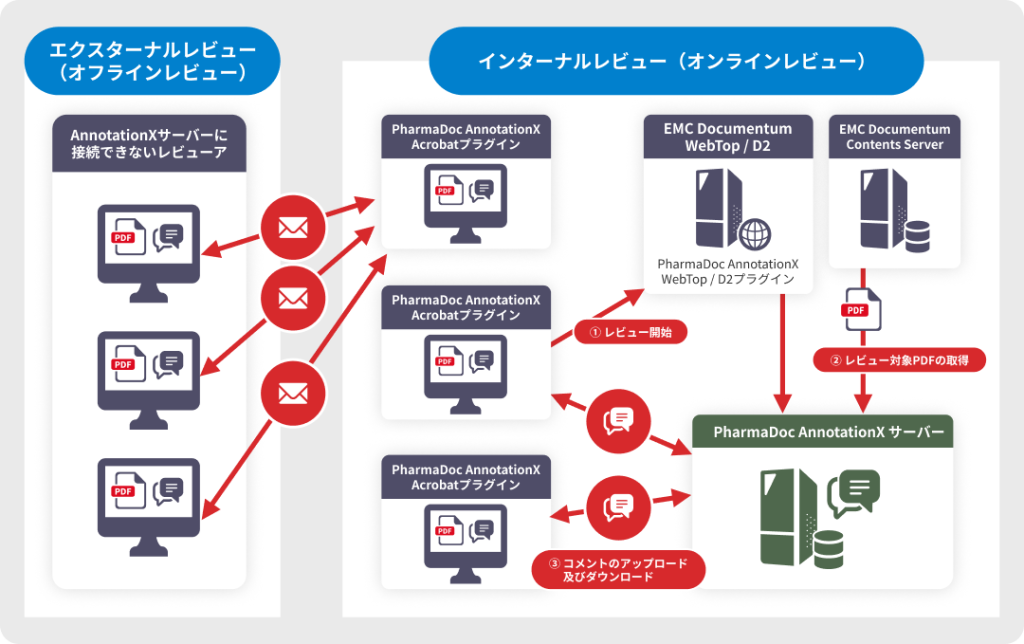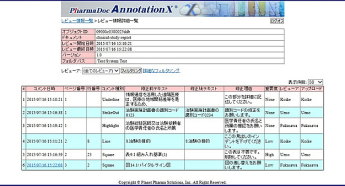 PharmaDoc AnnotationXは、PDFファイルを複数人で共有レビューするための専用システムです。コメントの定型入力やPDF内の行番号表示で効率良くレビューを実行し、コメント一覧の書き出しにより文書の修正業務もスムーズにします。また、外部ユーザーとのオフラインレビューもサポートし、複数拠点・多様な体制でもレビュー作業を円滑・高効率に進めます。