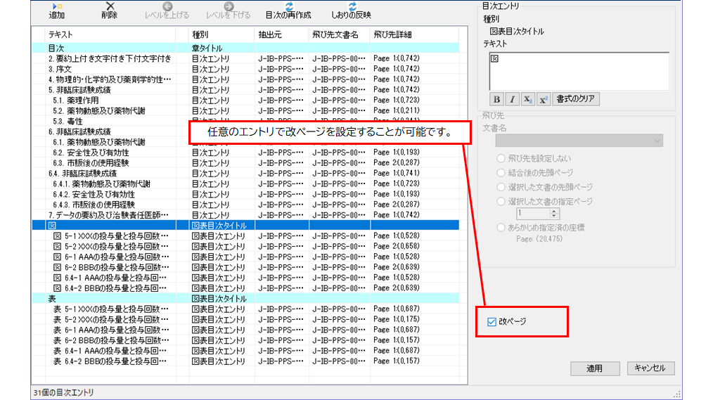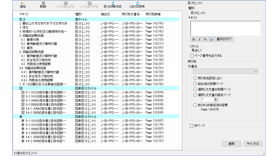 プレビューの状態で、目次の文字列、文字属性、しおりの文字列、階層を編集することが可能です。