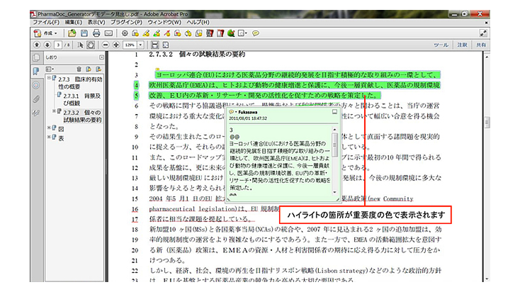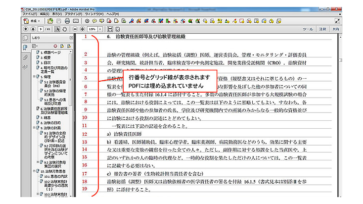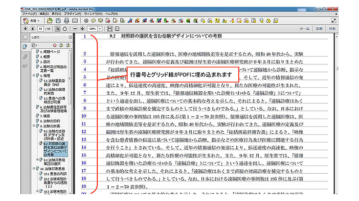 本機能により、当局や、共同開発会社、CROとのオフラインPDFレビューにおいて、PDFに埋め込んだ行番号をもとにレビューが行なえる為、レビュー作業における指摘箇所の確認が容易になります。