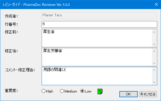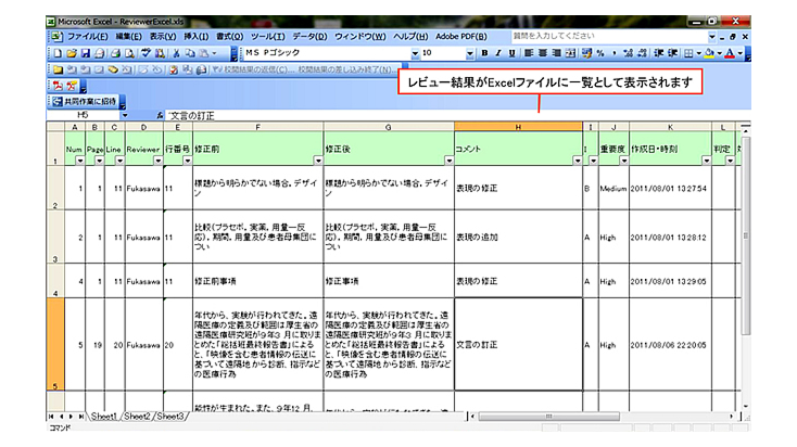 レビューコメントにおける行番号、修正前、修正後、修正理由、重要度の定型入力を支援し、ワンクリックでレビューコメント一覧をExcel出力します。 これにより、PDFレビュー作業およびWord文書の修正作業を効率良く行う事ができます。