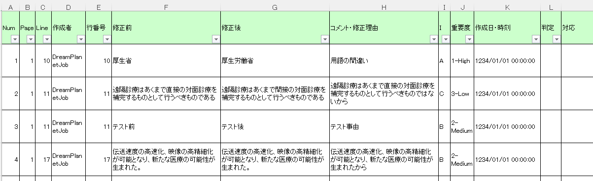 It supports the standardized input of line numbers, before, after, reason for revision, and importance in review comments, and outputs the review results to Excel at the touch of a button. This allows for efficient PDF review and correction of Word documents.