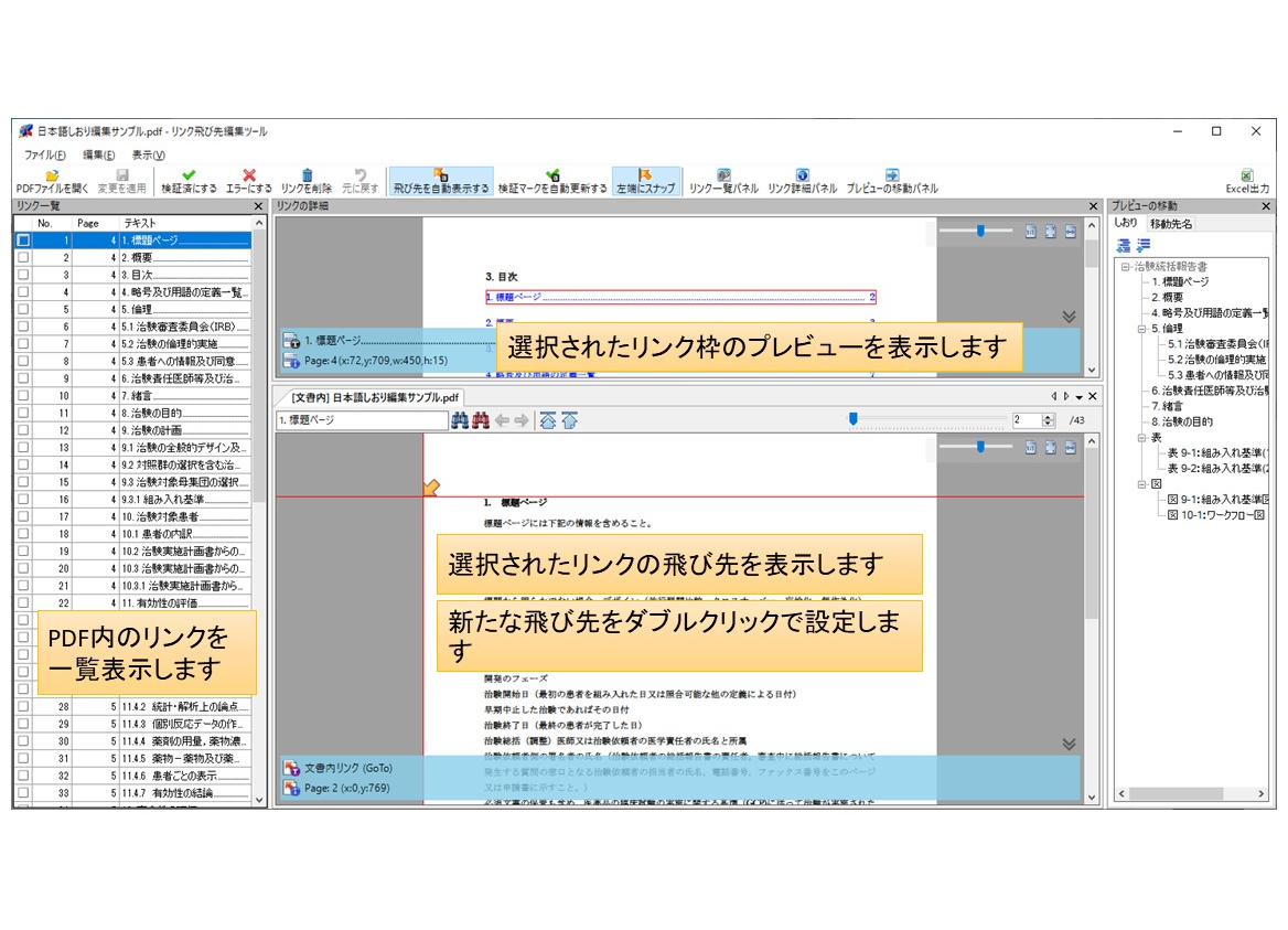 しおりとハイパーリンクの飛び先の確認・編集作業を効率化するために、専用のツールを別途用意しています。