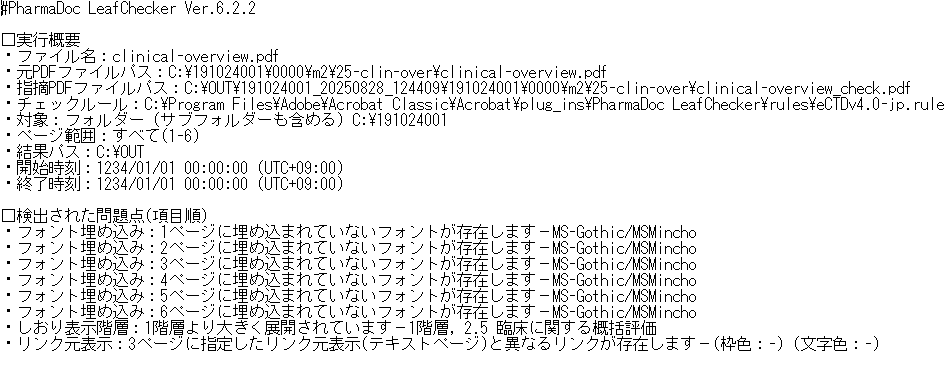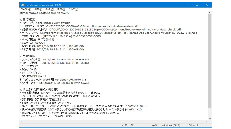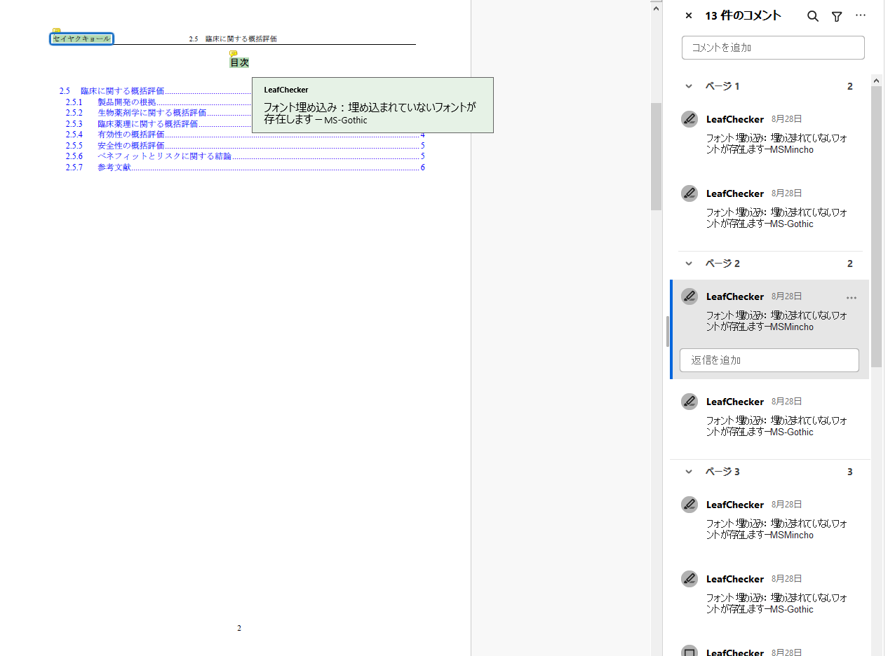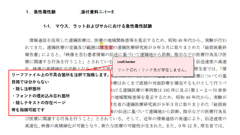 チェック結果は、要約レポートでどのファイルのどのチェックで問題が発生したのか一覧で確認できます。 指摘のあるリーフファイルは、要約レポートから直接リンクで指摘PDFと指摘テキストを開き、問題箇所の確認ができます。 問題箇所に注釈を付与していますので、問題箇所の特定が容易です。