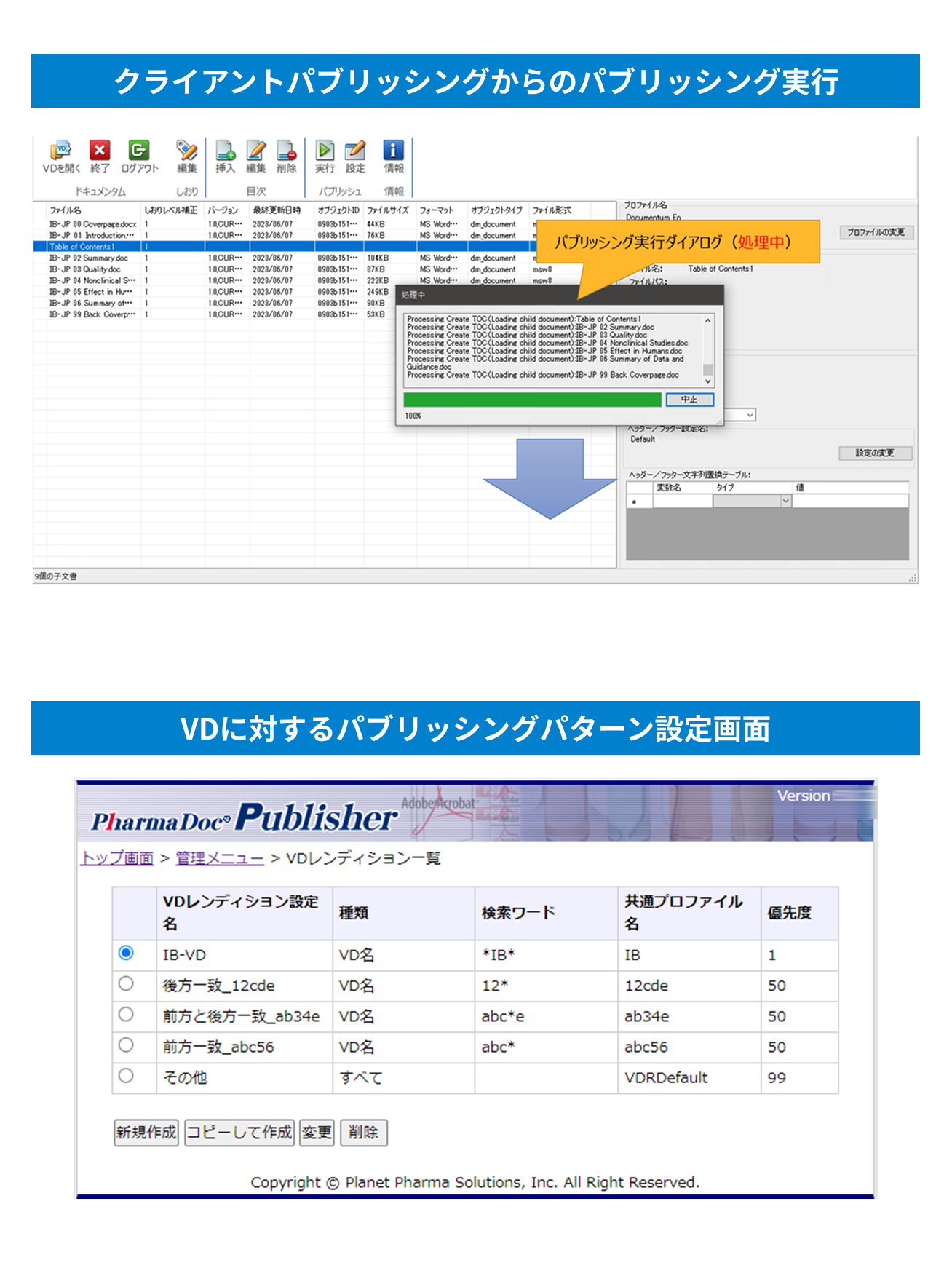 - パブリッシュによって作成されたPDFファイルを,VDのレンディションPDFファイルまたは単独のPDFファイルとしてユーザーの手を介さずに自動的に格納することが出来ます。