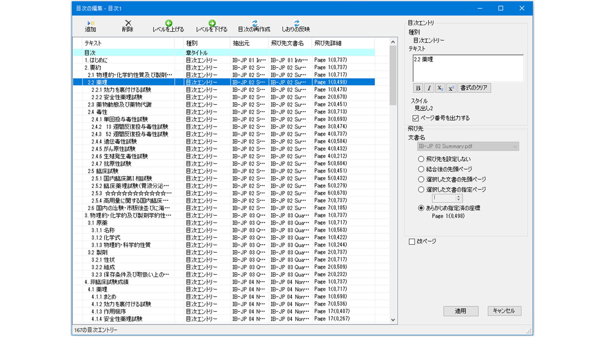 - リーフPDFファイルを作成する際に,簡単にしおりの編集や目次ページの作成,ヘッダ/フッタへの文字列の流し込みが可能です。