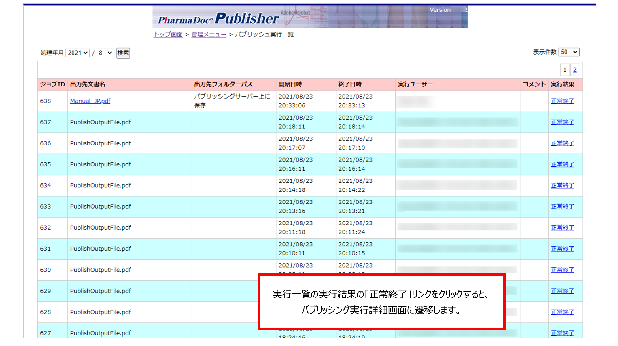 パブリッシングの実行状況を実行一覧画面で確認することができます。